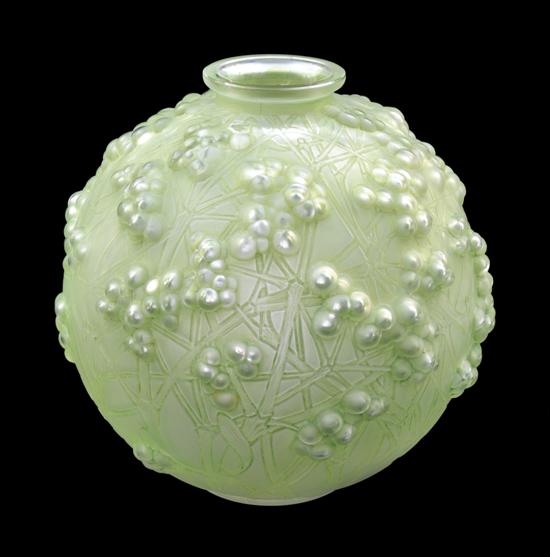The spherical body with a narrow neck mould pressed and with a green stain to the reserve, displays an overall dense overlapping network of etched stems and studded throughout with clusters of berries in low relief, moulded R.LALIQUE to base, 18cm high.