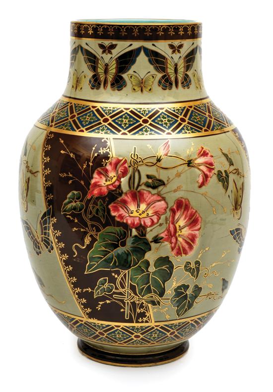 The ovoid vase with wide tubular neck decorated in an Orientalist manner with bold floral bouquets and rows of butterflies interspersed by bands of geometrical patterns, impressed Sarreguemines 1489 to base, 43.5cm high.
