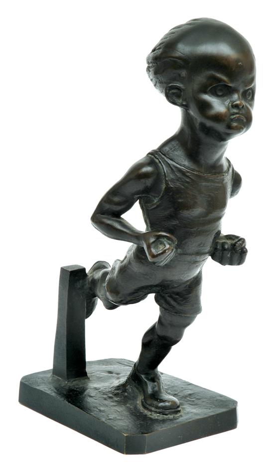 The stylised figure depicted exerting himself through an athletic pursuit, mounted upon a rectangular base, incised Coffin to base, 26.5cm high.