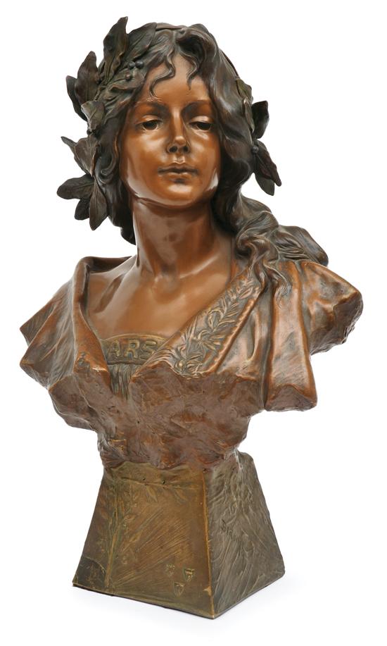 Modelled as a young maiden wearing a laurel in her hair and with draped collar around her shoulders all raised upon a triangular base, incised to side Blasche and with further impressed marks to inside of base, 53.5 cm high.
