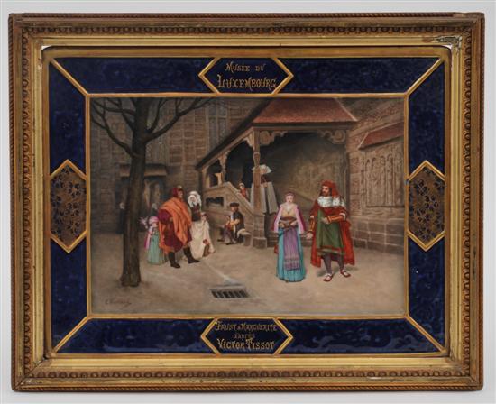 Depicting a medieval courtyard scene with men, women and children dressed in costume of the day, bordered by a cobalt and gilt enamelled border and inscribed Musee du Luxembourg, Faust & Marguerite d'apres Victor Tissot, set within a moulded gilt frame, the plaque 29 x 38.5cm.