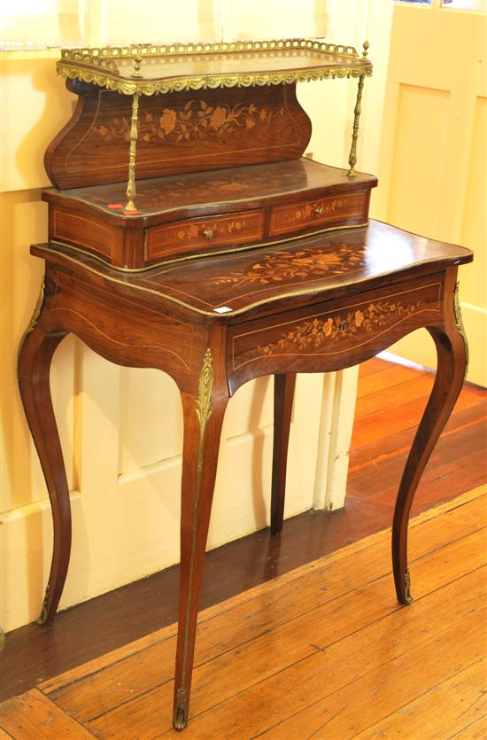The shaped back with a gallery edged display shelf supported by foliate cast columns above two drawers, the lower section with a singled frieze drawer, the whole with foliate marquetry and gilt metal mounts, raised on cabriole legs with sabots, 68 x 109 x 44.5 cm.