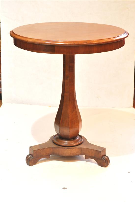 Circular, with a facetted baluster standard, raised on a tripartite platform base with reeded feet, 64 cm diameter x 74.5 cm high.
