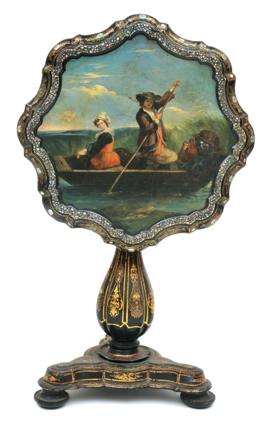 The lobed circular tilt top finely painted with a romantic scene depicting a man and his lady seated in a boat, within a mother of pearl encrusted surround, raised on a lobed baluster stem and a tripartite platform base, 63.5 cm wide x 70 cm high.