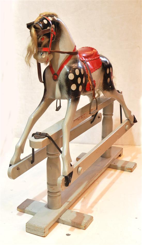 Carved and with applied polychrome decoration, leather saddlery, mane and tail,117 cm wide.