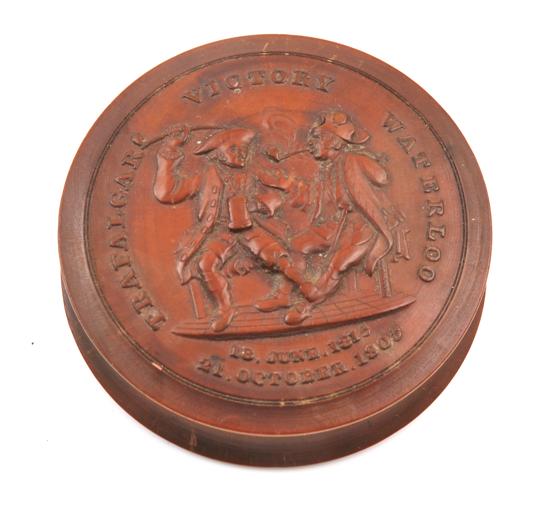 The circular boxwood box with push on cover featuring a pressed scene to the lid depicting a figurative scene and inscribed TRAFALGAR VICTORY WATERLOO, 18.JUNE, 1815, 21.OCTOBER.1805, 7.5cm diameter.