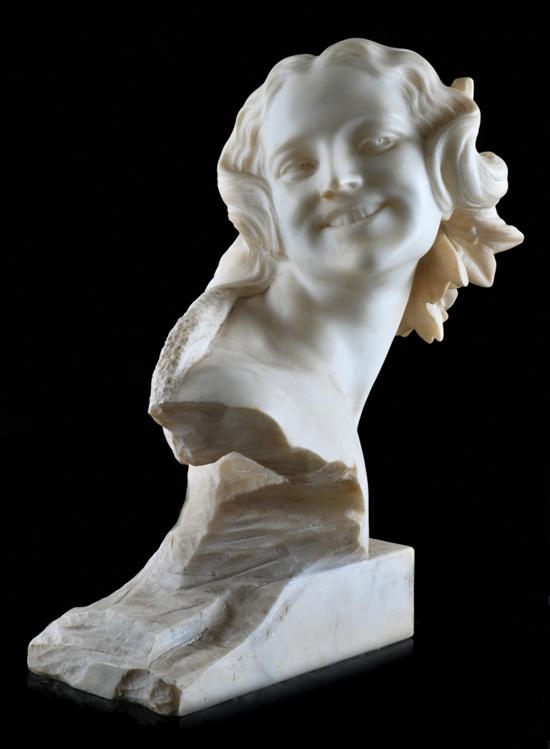 Realistically carved as a coy young maiden, her head averted, a textured cloth adorns her shoulder raised on a block base, incised signature to side, 49.5cm high.