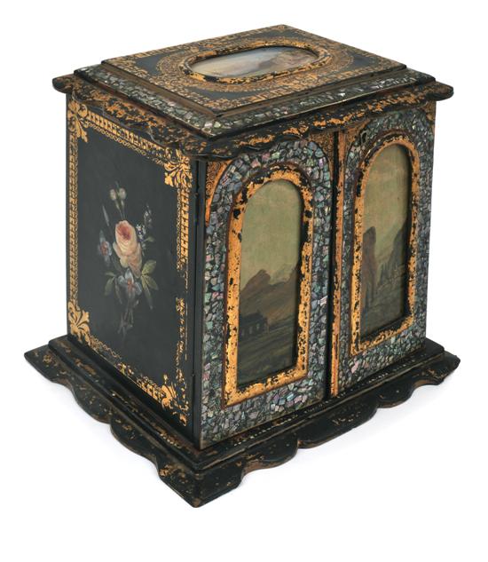 The rectangular body decorated with hand painted scenic plaques and bordered by mother of pearl bands and applied gilt decoration, with a hinged lid opening to reveal a series of sewing related compartments, and a further pair of hinged doors opening to reveal a fitted interior of drawers and a folded writing plane below, 29.5 cm high.
