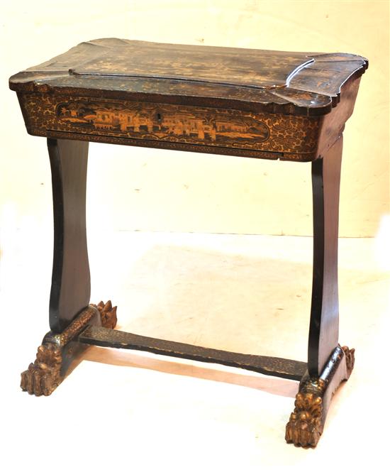 Decorated throughout with gilt figurative vignettes on a black lacquered ground, the rectangular table top with shell shaped corners above a shallow compartment containing a fitted interior with further lacquered trays and lids, all raised upon a twin pedestal stretcher base with clawed feet, (some cracking to lacquer and loss to gilt), 64 x 70.5 x 43 cm.