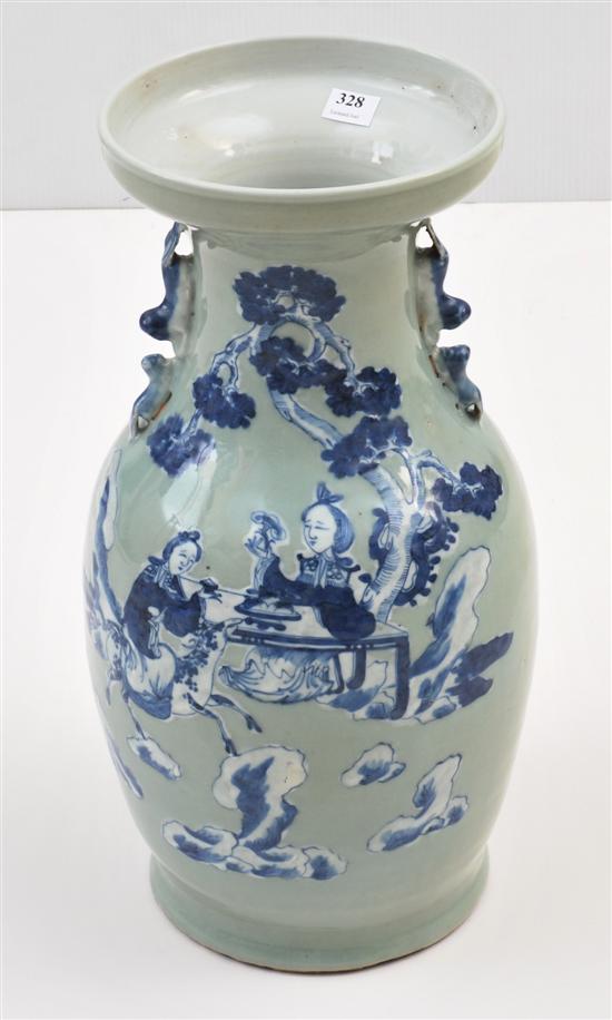 The tall ovoid vase with wide flared rim to neck styled in the Longquan manner with double foo dogs lugs to each side and displaying a figurative scene in blue and white on a celadon ground, 43.5cm high,