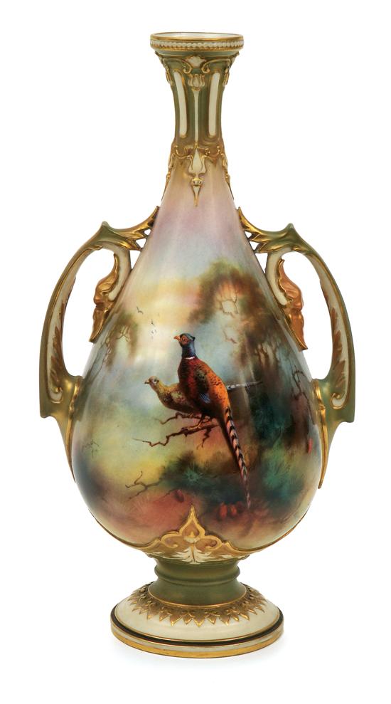 Of teardrop form, raised on stepped foot decorated with a vignette of pheasants to front band a woodland to verso, flanked to each side with pierced terminals and rising to a slender neck, signed to front and with green factory marks to base, 26 cm high.