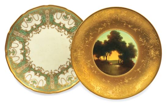 The first painted with a scene depicting cattle grazing set within a gilt embossed band, signed to front Kelsall and with puce factory mark to base; the second decorated with a band of green and gilt embossed overlaid, green factory mark to base, 22.5cm diameter (each).
