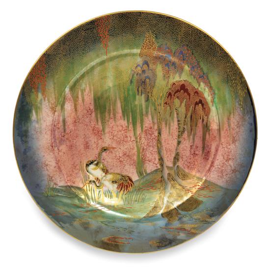 The shallow platter with flattened rim displays the New Stork pattern number 4280 on a mottled lustre ground, black factory mark to base and with further hand painted notations, 37cm diameter.