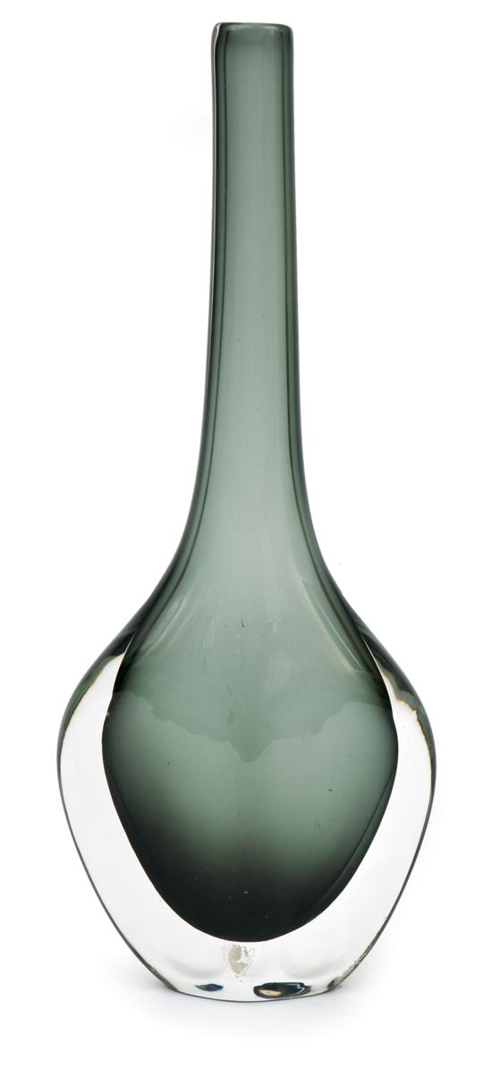 The mallet shaped vase, flattened and compressed in clear glass with a submerged translucent green glass layer rising to the tall tubular neck, incised orrefors, vn, 3538/1 to base, 36cm high.