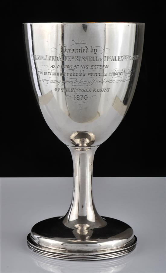 The large cup raised on a footed stem and incised with a dedication 'Presented by Colonel Lord Alex .R. Russell to Mr Alex R. Frazier, as a mark of his esteem, and in return for valuable services rendered by him, during many years to himself and other members of the Russell family, 1870', 372grs total weight of silver, 21.5cm high.