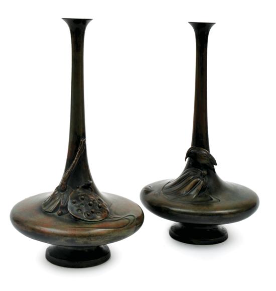 Each of a low set compressed lantern form with tall slender neck and featuring individual relief motifs, the first a small water bird perched on a lily pad, the second a small frog resting on a lotus pod, each signed to base, 33cm high.