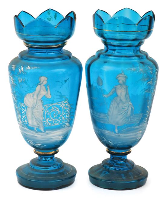 A pair of Mary Gregory cerulean glass vases