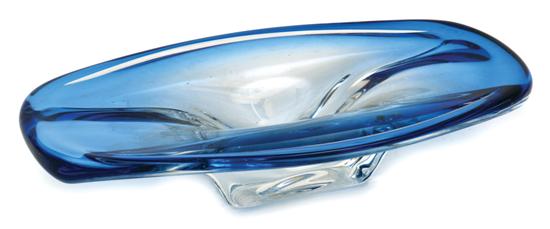 The rectangular bowl in translucent royal blue rising from a clear blocked base, incised Val St. Lambert to base, 40cm long.