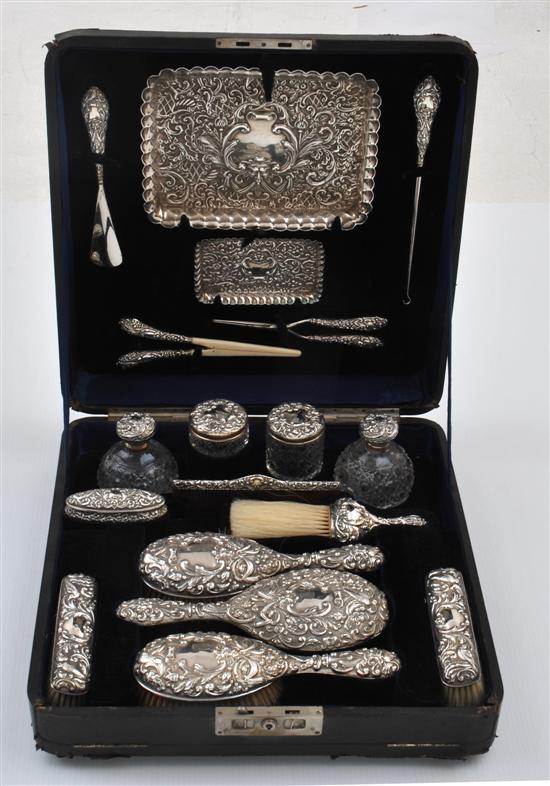 Fashioned in a neoclassical manner with repousse patterns of scrolled shields, masks and partridges within a ground of flora and lattice, the eighteen piece set including two trays, two hair brushes and a mirror, three clothes brushes, four cut crystal jars, one lidded box, one comb, one shoe horn, one button hook, one curling tong and one glove stretcher, housed within the original velvet and satin lined box, the box 43cm long.