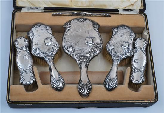 The six piece set featuring an ocean scene of a Viking ship at sea surrounded by rolling waves and seashell motifs, including two clothes brushes, two hair brushes, one mirror, and one comb all housed in an accompanying box of the period, the box 43.5cm wide.