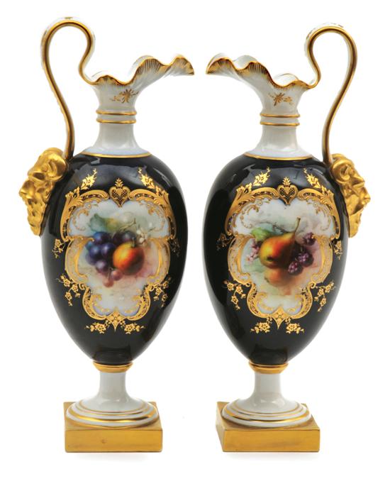 Each with an ovoid body, centred by a fruit cartouche within an embossed gilt border, a foliate sprig to the opposing side, beneath a leaf moulded rim and a loop handle, raised on a square foot, green factory mark and model no. 1144, 26.5 cm high.