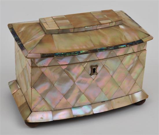 The sarcophagus shaped caddy inlaid with mother of pearl throughout to the exterior in a chequered and blocked fashion and edged with abalone shell, opening to reveal the original fitted interior with twin lids also of chequered mother of pearl inlay, 19.5cm wide.