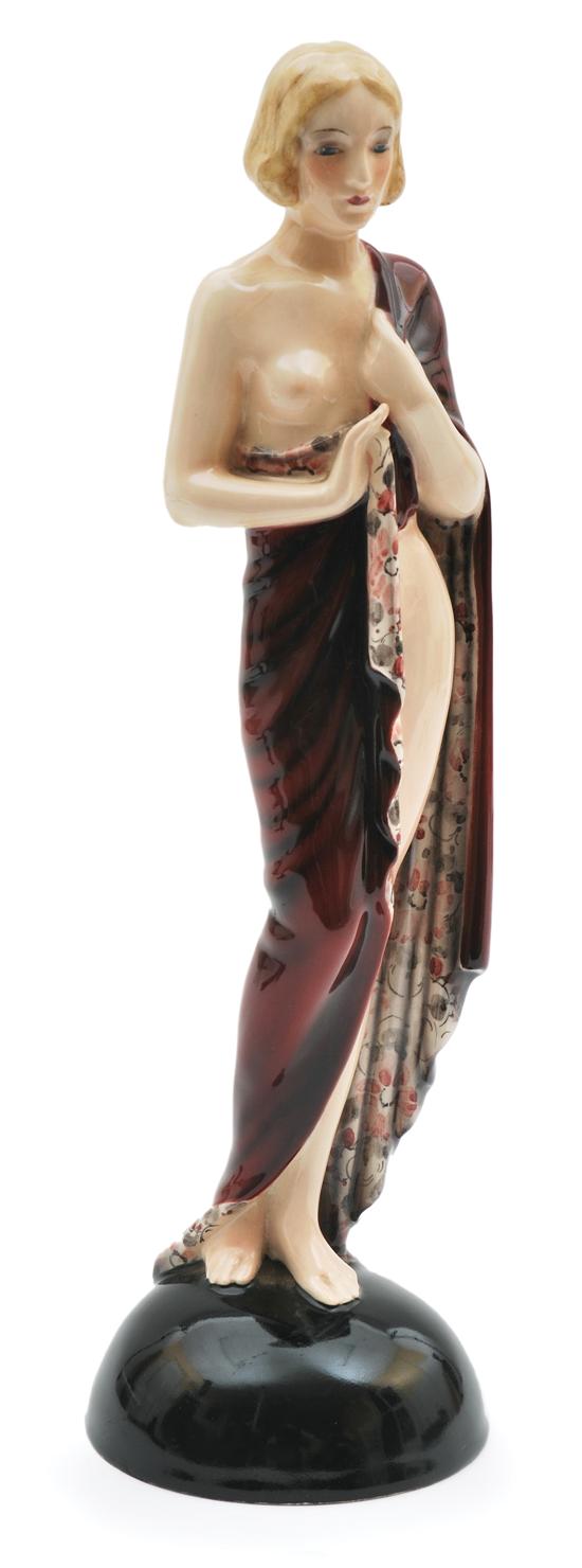 The standing, semi-draped woman modelled with a plum patterned cloak mounted upon a black painted dome, stamped Lorenzl Goldscheider, Made in Austria, with paper label and further impressed numbers to base, 33.5cm high.