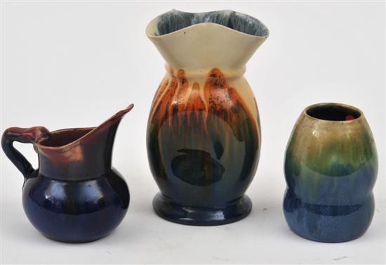 A group of three earthenware vessels, comprising a small vase with dimpled body and flared rim incised 277,a small high lipped jug with applied gum nut and leaf with branched handle incised 119/ M and a small low waisted double bulged vase incised 23, each also incised Remued, the tallest 16cm.