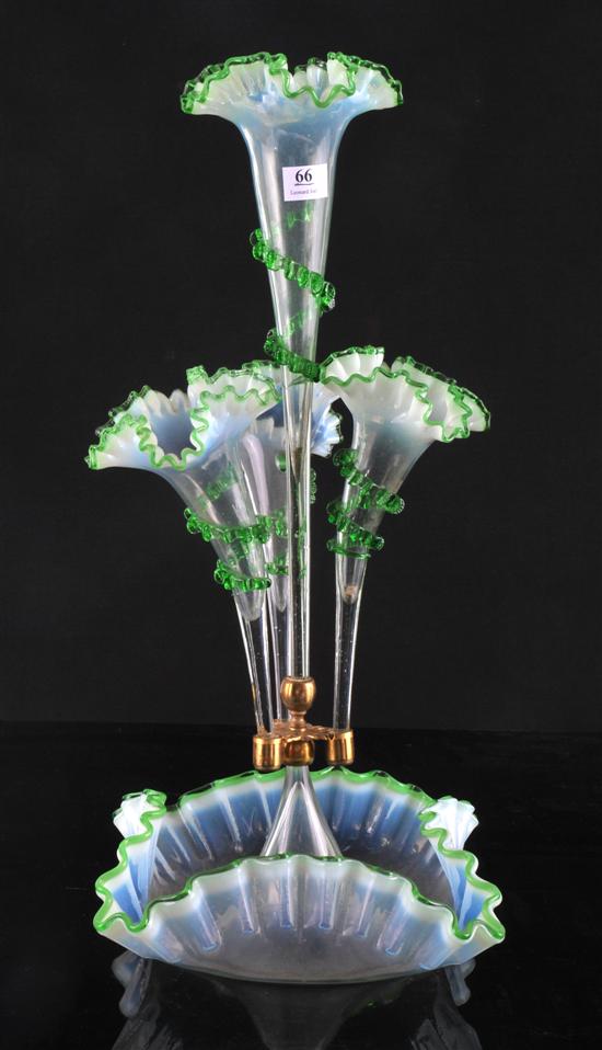 The square base with turned in corners and folded with frilled rim supporting a central single trumpet and with three corresponding curved trumpets also each with frilled rims,48cm high.