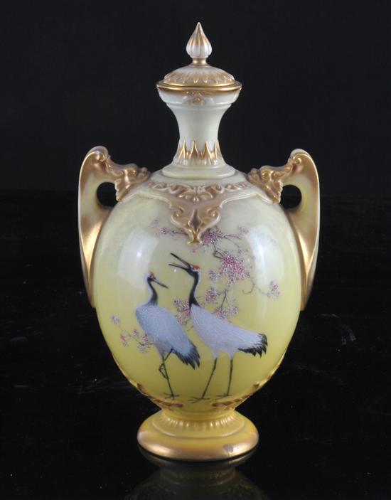 The ovoid body with pierced terminals to each side and with fitted cover above a slender neck decorated with a pair of cranes on a butter yellow ground, puce factory mark to base, 20.5cm high.