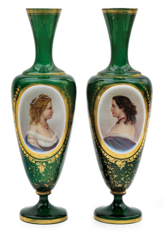 Each of baluster form on a footed base and with trumpet necks, overlaid in white with a hand painted portrait cartouche of a women alternating on each, framed with further applied gilt enamelling and a patterned ground, 35.5cm high.