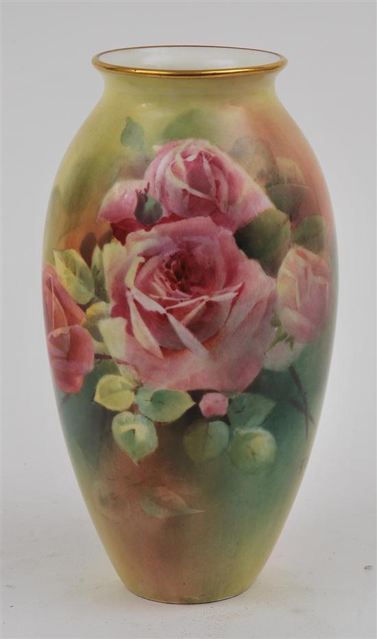 Of ovoid form, with a flared rim decorated with a bloom of pink roses on a mottled green ground, green factory mark to base, 21cm high.