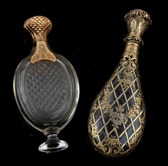 One with a body of teardrop form with applied silver lattice and floral swags, beneath a hinged, foliate embossed cover enclosing the original glass stopper, 11.5 cm high; the other of flattened form with a hinged, bright-cut gold cover (tested as gold), 10 cm high.