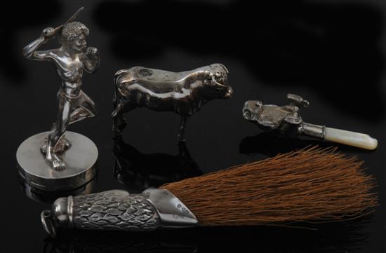 Comprising a finial cast as an Aboriginal male with a boomerang held aloft, Drummond (William), Melbourne, 1890; a bull shaped cruet, Adie & Lovekin Ltd, Birmingham, 1908; a hoof shaped crumb brush, Cornelius Desormeaux Saunders & James Francis Hollings (Frank) Shepherd, Chester, 1899; and an anamalier baby rattle in the form of a bear, Birmingham, 1912, the Aboriginal figure 10cm high.