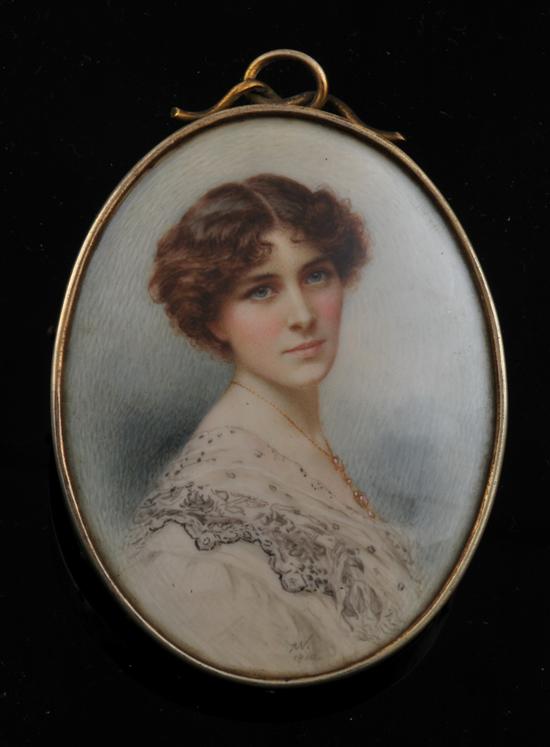 The portrait of a pretty young lady set within a gilt metal surround and further incised to verso Peggy Woolrabe July 1907, 10.5cm high.