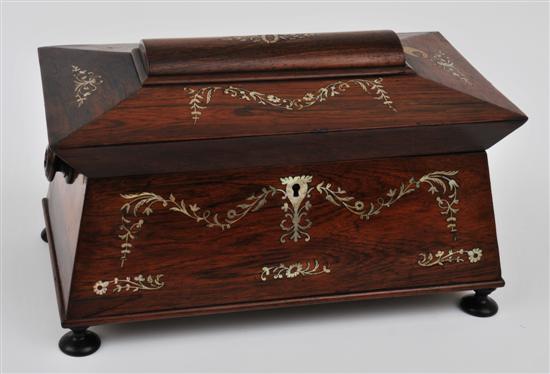 A Regency rosewood tea caddy with mother of pearl inlay