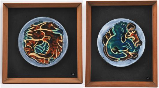 A pair of glazed earthenware circular plaques, one carved in low relief depicting a fishes the other also carved in low relief depicting a wolf, individually framed and with incised signature to edges, 18cm / 17cm diameter.