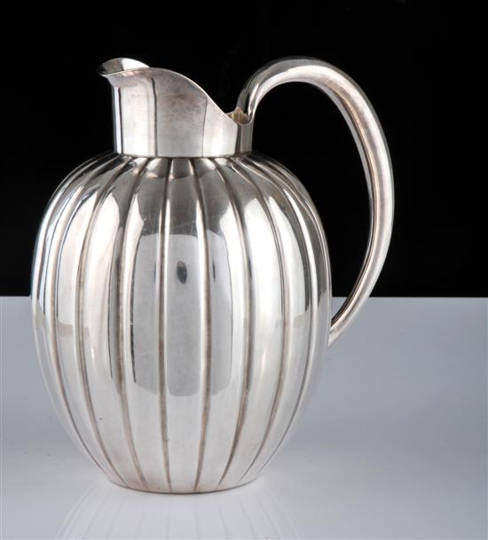 Of ovoid ribbed form surmounted by a plain collared spout and looped handle, signed Sigvard and stamped Georg Jensen Denmark Sterling, 856 A to base, 440 grs. total silver weight, 16.5cm high.