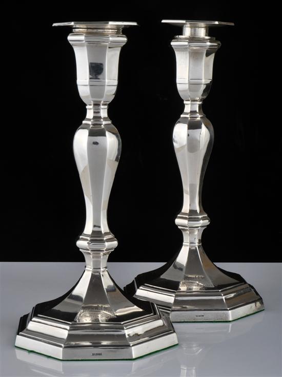 Each fashioned as an octagonal columnar form waisted and with a flattened pan above raised on a tapered foot incised with dedication 'Captain E.E. White, from his brother Officers, 9 July 1912', ( weighted bases ), 27cm high.