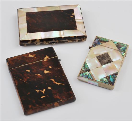 The first rectangular and cushion cut inlaid with tortoiseshell veneer and mother of pearl borders with a concertina insert internally, the second a rectangular flip top inlaid with tortoiseshell veneer and thirdly a small rectangular flip top inlaid with mother of pearl and abalone shell, the largest 11cm long.