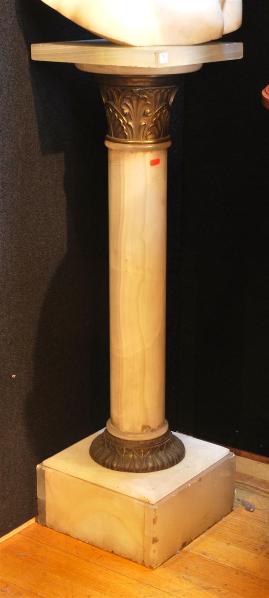 The square top raised on a cylindrical stem with a leaf cast gilt metal capital, above a square foot, 107 cm high.
