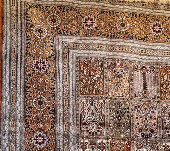 Featuring a repeated block design pattern, filled with alternating motifs within a floral ground of colours ochre, rust, chocolate and navy, 305 x 205 cm.
