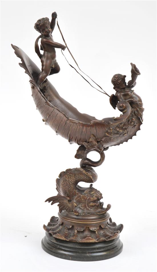 The scallop edged base supporting a single dolphin with tail entwined and holding above a deep open shell with a pair of putti riding atop, mounted upon a circular marble plinth, 37cm high.