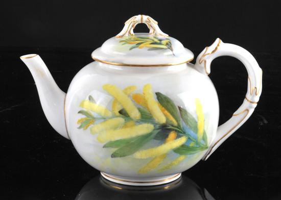 The spherical form with foliate moulded handle and low domed cover each displaying a sprig of ' Golden Wattle ' on a white ground with gilt highlights, hand painted Golden Wattle and with puce factory mark to base and underside of lid, 20cm wide.