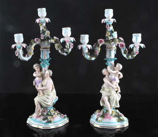 Each with a stem moulded at the base with a figure of a woman and child, beneath a three arms terminating in sconces, a further sconce to the centre, raised on a shaped square base with applied floral bocage, underglaze blue mark, 47 cm high.