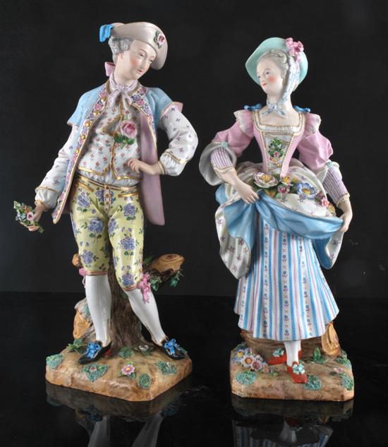 Modelled as a gentleman and his lady companion, each in brightly coloured and pattern attire, raised on a naturalistically modelled base, underglaze blue factory mark, the tallest 51 cm high.