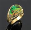 The boulder opal of free form, displaying a fine play of colour, bezel set within an abstract wide shank with textured finish, in 18ct gold, ring size Z+.