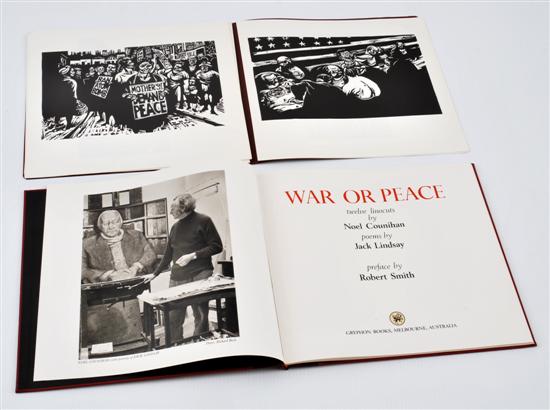 War Or Peace, Gryphon Books, Melbourne, not dated but circa 1979, limited edition 54/250, signed 'Jack Lindsay' and 'Noel Counihan' to back, red clothboards, gilt lettering to spine and cover, including folio of twelve linocuts by Counihan, both contained in red cloth board slipcase