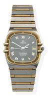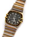 Quartz movement, oblong black dial with Roman numerals, date aperture at three, signed case, dial and movement, stainless steel and gold case with conforming bracelet bands, total length 190mm, 30mm diameter.