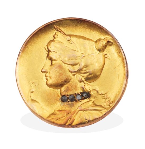 The gold cameo depicting a woman in profile with rose cut diamond detail, bezel set in 9ct gold, hallmarked R.L., ring size N-O.
